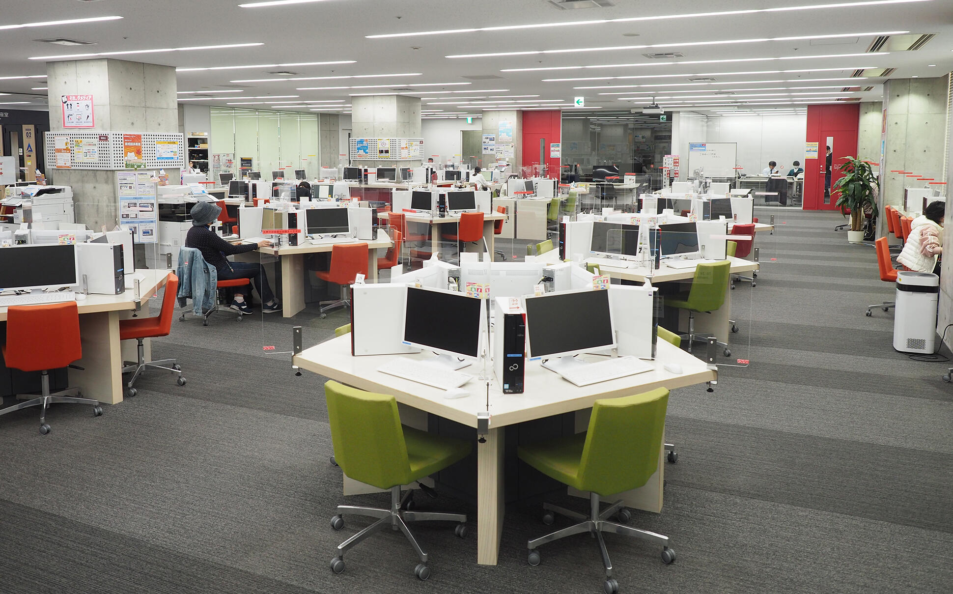 『情報メディアセンター』の設置当初から、受付業務には派遣スタッフやアルバイトのほか、 “学生スタッフ”が従事していました。「学生スタッフ」とは、『情報メディアセンター』ではたらいている愛知大学の学生です。