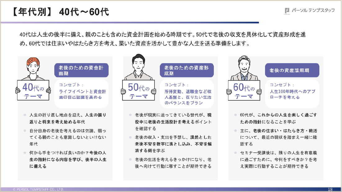 - 各年代別のテーマに合わせたキャリアとお金の考え方