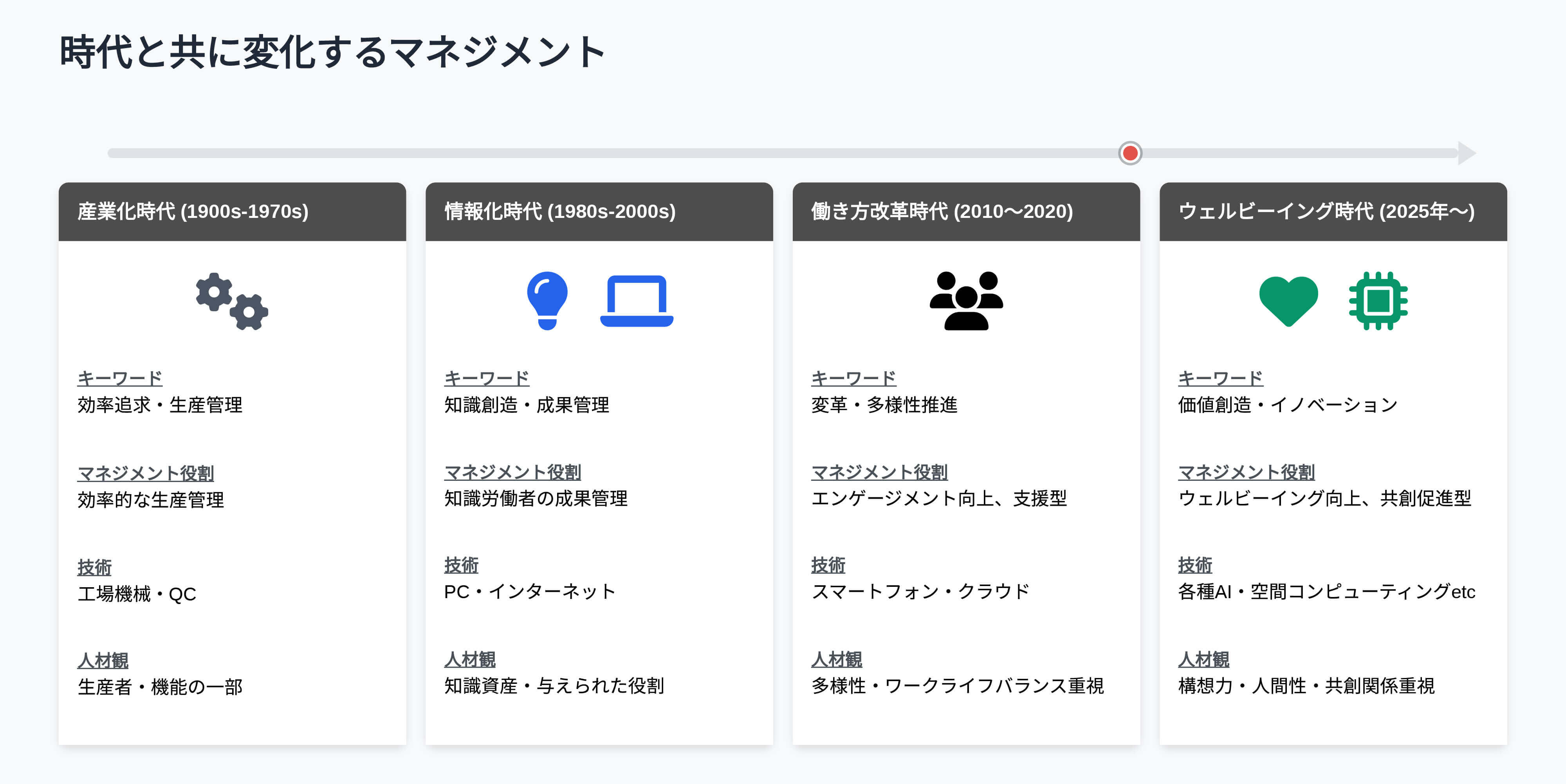 マネジメントの歴史を振り返ると、時代とともにその役割は大きく変化してきました。産業化時代では、マネジメントは「効率的な生産管理」が中心でした。情報化時代に入ると「知識労働者の成果管理」が重要になりました。そしてデジタル変革時代の今、マネジメントに求められるのは「人の創造性と幸福度を高める」ことへ進化が求められています。