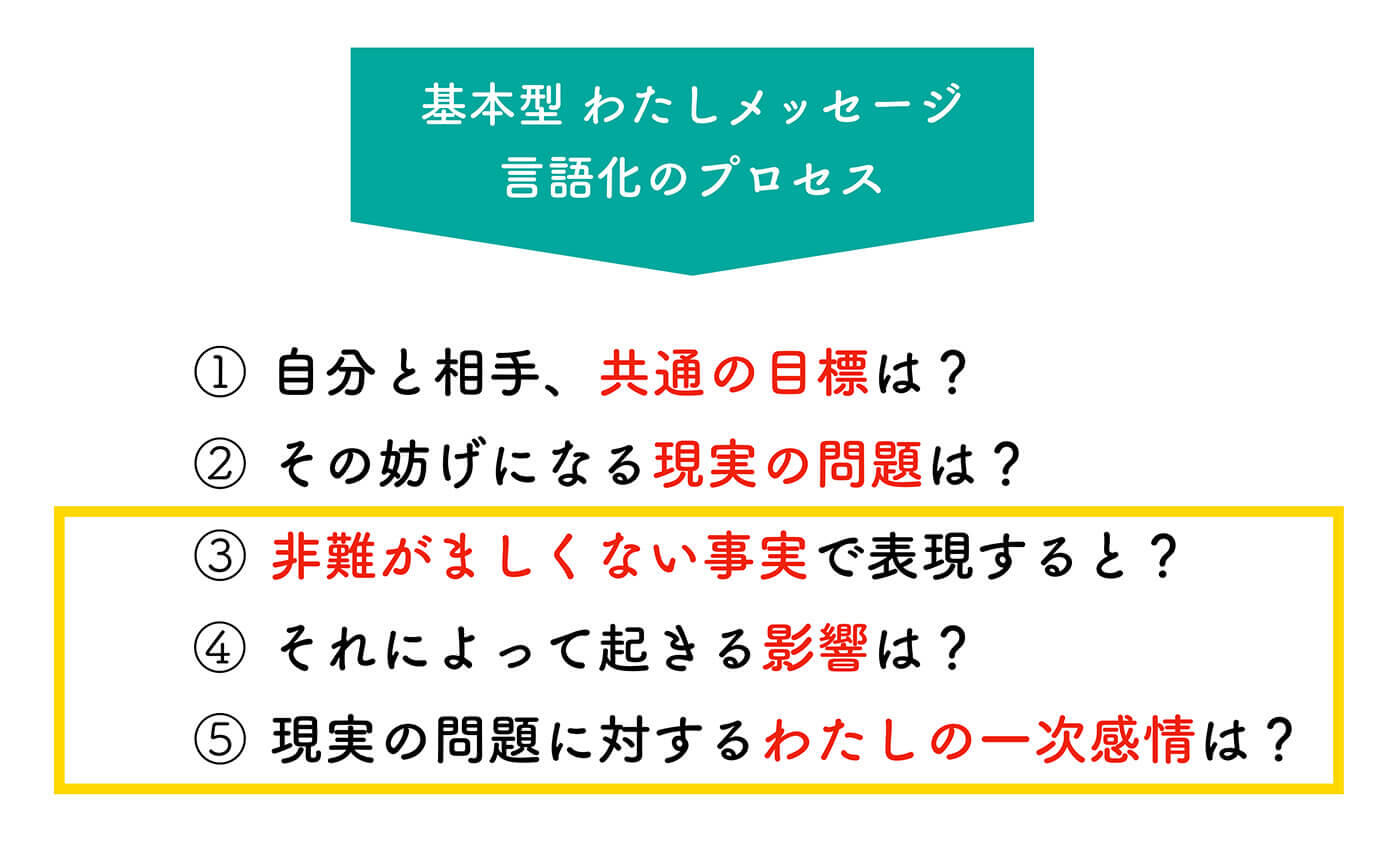(3)(4)(5)が「わたしメッセージ」になりますね。基本型の「わたしメッセージ」を使って伝えていくには、どのように話したらよいでしょうか。