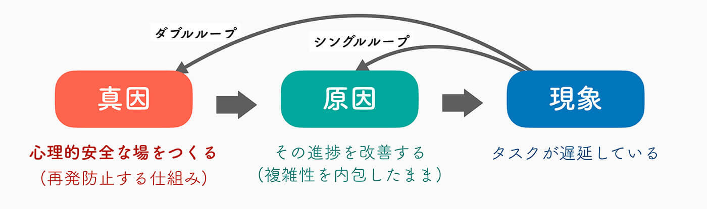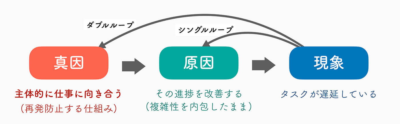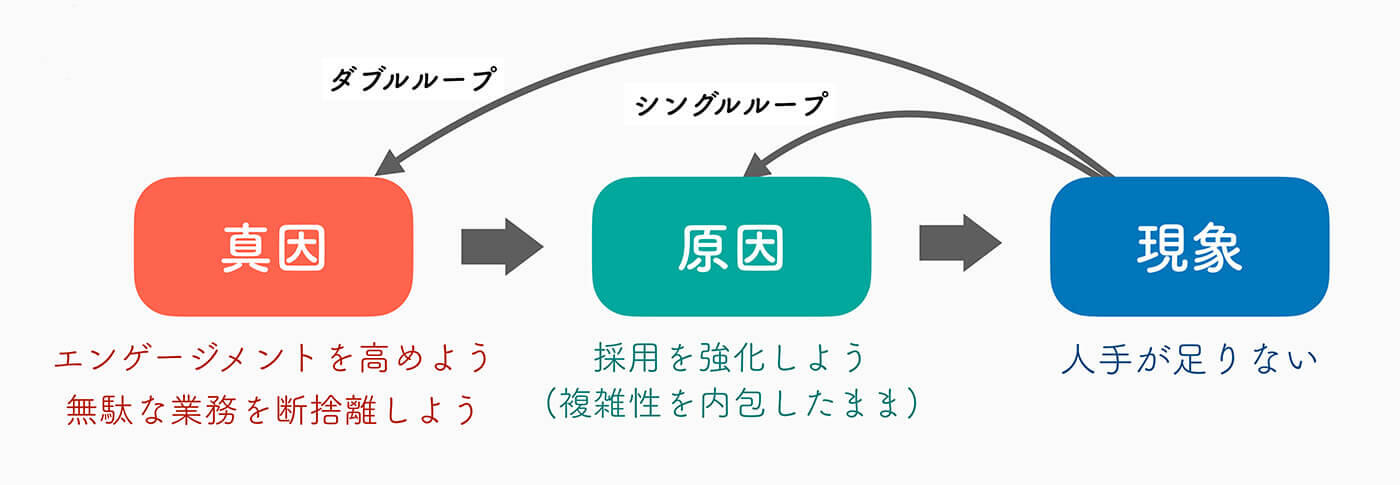 ここで、問題発生時に根本を解決する思考法と言われている「ダブルループ学習」をご紹介します。「ダブルループ学習」とは、複雑な問題の根本には何があるのかを考え、真因を改善する思考法のことです。