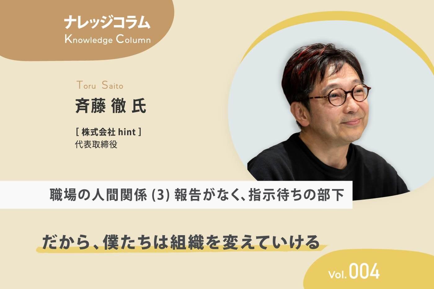 hintの創業者で、書籍『だから僕たちは、組織を変えていける』の著者、斉藤 徹 氏による連載コラムです。第4回は「職場の人間関係(3)報告がなく、指示待ちの部下」です。