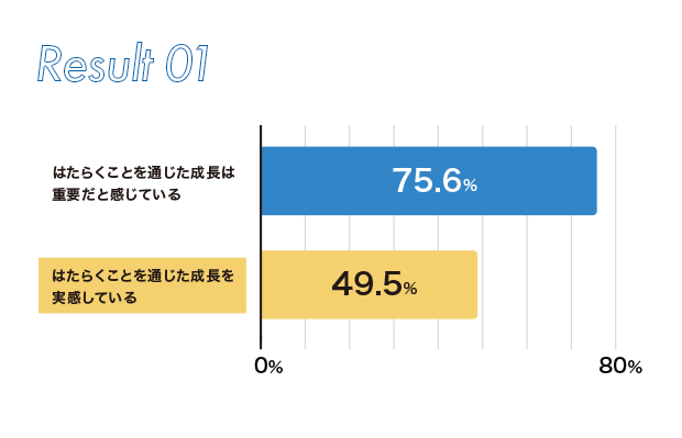 「はたらくことを通じた成長は重要だと思いますか?」という問いに対し、「重要」と答えた派遣スタッフは75.6%。一方、はたらくことを通じた成長を「実感」している派遣スタッフは49.5%と乖離がみられる。