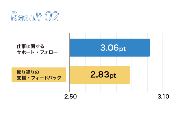 職場での支援において、「仕事に関するサポート・フォロー」があると回答した派遣スタッフが3.06ptであるのに対し、「振り返りの支援・フィードバック」の機会は2.83ptと下回る。